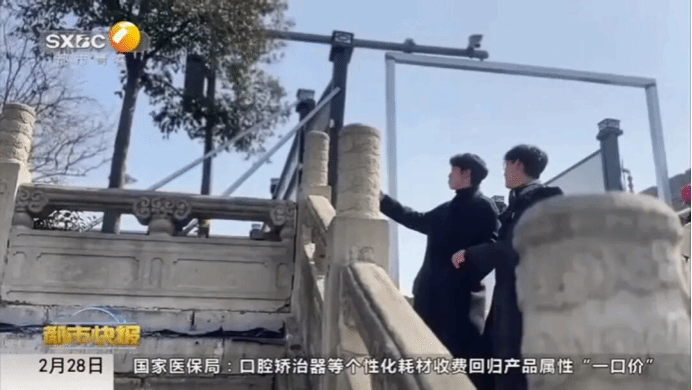 注意到下沉广场护栏外