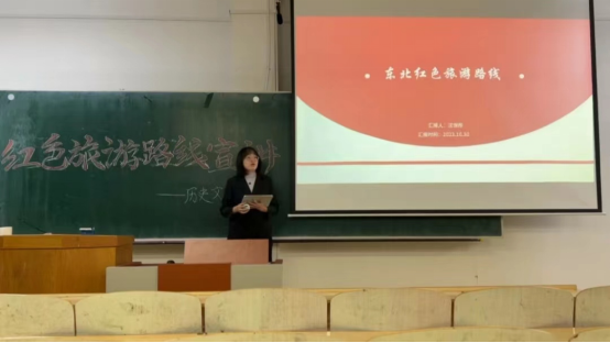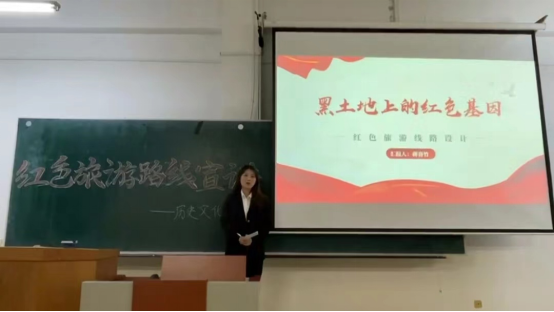为深入学习贯彻党的二十大精神和习近平总书记在哈尔滨主持召开新时代推动东北全面振兴座谈会上的重要讲话精神,牢牢把握时代使命,助力东北全面振兴,历史文化学院结合学科专业特色,举办红色旅游路线设计宣讲大赛。