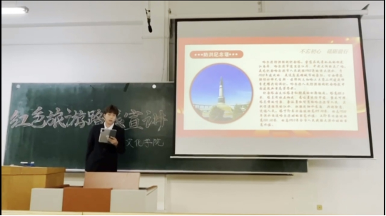 “弘扬红色文化,打造红色中国。”孙鸿庆同学为大家详细介绍了防洪纪念塔,八女投江纪念馆,四平战役纪念馆以及辽沈战役纪念馆这四处红色旅游地点.“雄关漫道真如铁,而今迈步从头越。”青春正当时,红色永流传。年少的你,总有几分稚嫩的青色,但内心一定仍火热。红色基因正在等待着有缘人的传承。