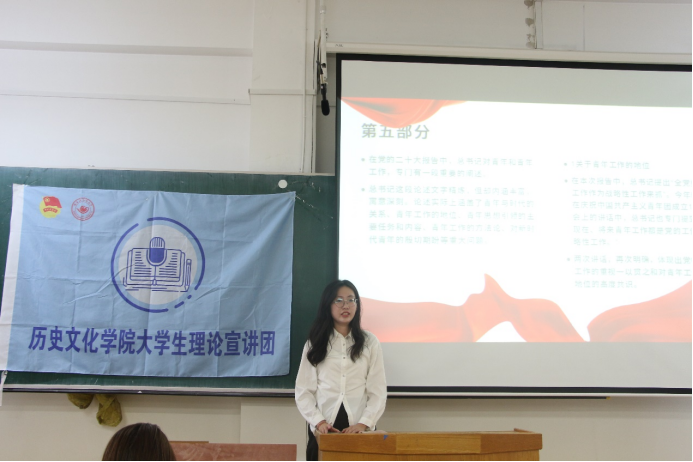为深入学习贯彻党的二十大精神,持续推进习近平新时代中国特色社会主义思想主题教育向青年学生延伸,扎实落实团中央"万场宣讲进青年"活动部署和团委青年宣讲"百千万"行动要求,推动校、院大学生理论宣讲团对共建工作走深走实。历史文化学院于2023年6月2日下午在人文楼227开展“学习二十大,永远跟党走”宣讲活动。本次宣讲会由历史文化学院大学理论宣讲团成员金萌、张泽倩两位同学主持。