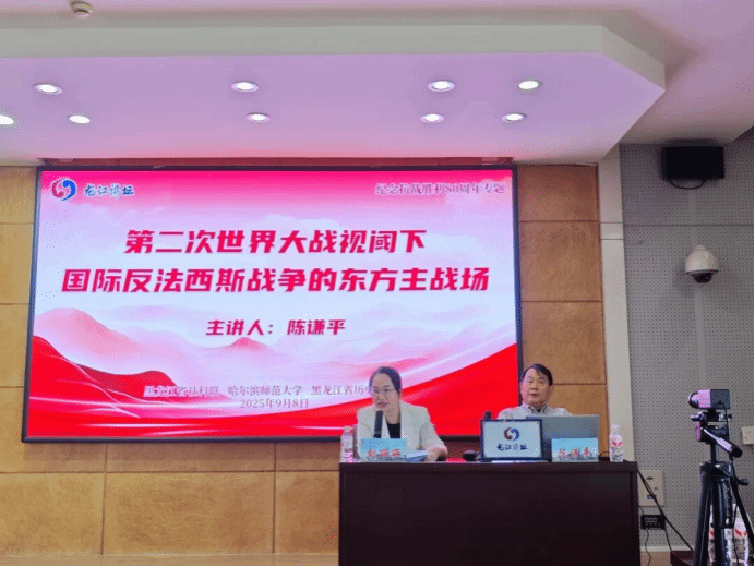 为纪念中国人民抗日战争暨世界反法西斯战争胜利80周年,2025年9月8日上午,由黑龙江省社科联、省文旅厅、省教育厅、省科协主办,哈尔滨师范大学、黑龙江省历史学会联合主办,黑龙江省图书馆、省社科联社科普及部、哈尔滨师范大学历史文化学院承办的“龙江讲坛”第856期专题讲座《第二次世界大战视阈下的中国东方主战场》在哈尔滨师范大学行知楼746会议室举行。本次讲座特邀中国抗日战争史学会副会长陈谦平教授主讲。讲座由哈尔滨师范大学历史文化学院副院长刘丽丽主持,省社科联社科普及部部长马琳及部分社科联党员干部、历史文化学院院长吴玲、副院长孙瑜、世界史学科带头人李淑娟、东北林业大学、哈尔滨师范大学马克思主义学院及历史文化学院研究生等百余名师生现场聆听。