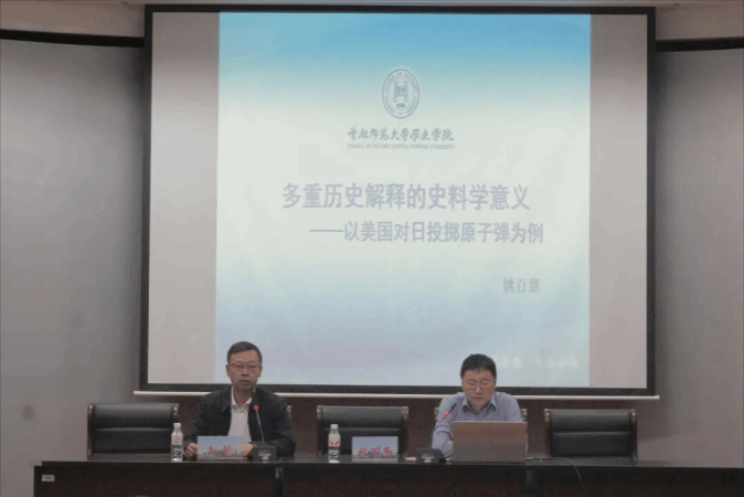 为纪念中国人民抗日战争暨世界反法西斯战争胜利80周年,2025年9月19日晚19时30分,学院特邀首都师范大学姚百慧教授以《多重历史解释的史料学意义——以美国对日投掷原子弹为例》为题,在人文楼516室举办学术讲座,本次讲座由历史文化学院副院长孙瑜主持,历史文化学院院长吴玲及首都师大历史学院和哈师大历史文化学院的部分师生共同聆听了此次讲座。