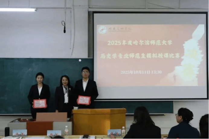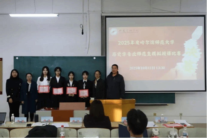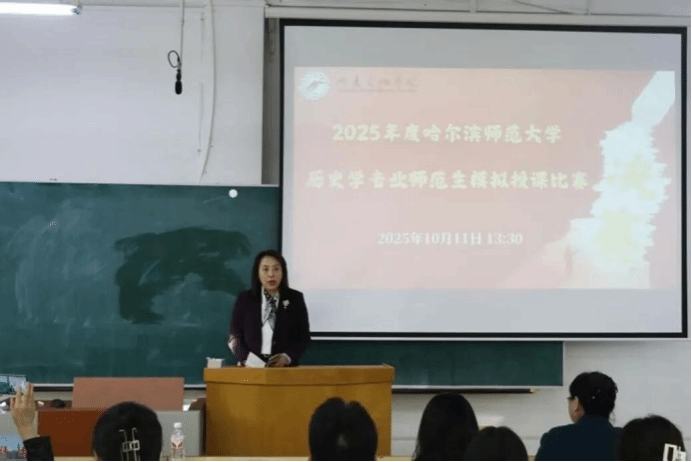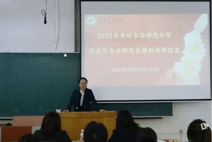 为深入贯彻教育强国理念,全面提升师范生授课能力,2025年10月11日下午,历史文化学院在人文楼433教室成功举办了2025年度历史学专业师范生模拟授课比赛决赛。本次活动特邀哈尔滨市高中历史教研员安丽宏老师、历史文化学院副院长刘丽丽、历史文化学院王耘老师、段永富老师,教师教育学院邵兰琴老师担任评委。