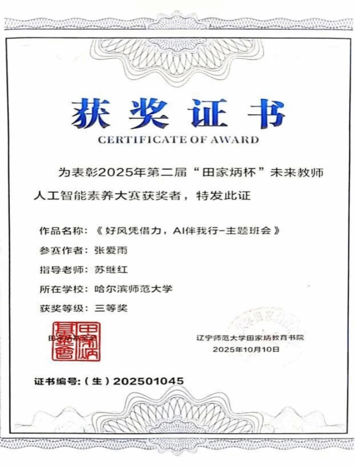 本届大赛作为面向未来教师人工智能素养的重要赛事,吸引了东北地区多所高校的优秀学子参与。从9月20日提交视频与AI创意设计参加预选,到10月9日线上决赛,进行说课与现场答辩,我院学子将优秀的专业素养融入灵动的教学展示中,最后王耘老师指导的2022级历史学专业关欣雨荣获课堂教学一等奖,苏继红老师指导的2023级历史学专业张爱雨荣获主题班会三等奖。