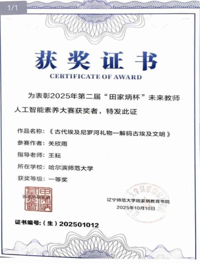 本次获奖是我院深化历史学师范专业人才培养模式改革的重要成果。从传统史学的深厚积淀到人工智能技术的创新应用,历史学子展现了跨学科融合的卓越能力。未来,学院将持续优化人才培养体系,强化理论与实践的结合,着力培养既具扎实史学功底又富创新精神的卓越教师,为促进教育高质量发展贡献更大力量。