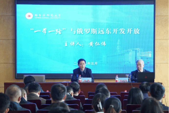 黄仁伟教授结合当前的国际形势,首先介绍了“一带一路”的新变化,共建“一带一路”面临的新形势,共建“一带一路”与双循环发展新格局以及“一带一路”面临的新挑战;其次讲述了中欧大通道的情况及中国东北地区在中欧大通道和“一带一路”的地缘优势;在此基础上,分析俄罗斯经济重心东移为我省带来的前所未有的历史机遇,指出俄罗斯远东地区的开发开放,特别是黑龙江流域是“一带一路”今后最大的方向和成果,并具体分析我省在粮食、木材、矿产加工、制造业等对俄合作中具有的显著优势及广阔的前景空间,强调我省深度融入共建“一带一路”与俄罗斯远东开发开放,必将深化中俄双方在教育、科研、文化、旅游等人文领域的交流与合作。